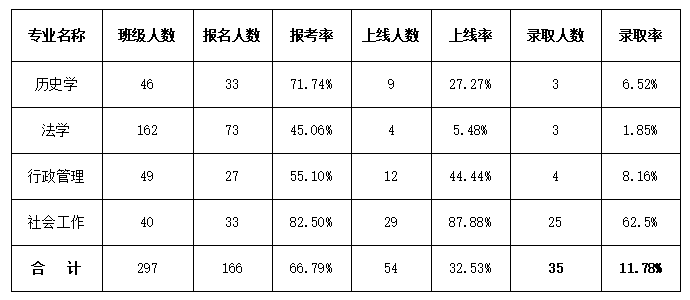 政法公司2022届本科毕业生共297人,其中166人参加了2022年硕士研究生入学考试,报考率达66.79%;上线54人,上线率达32.53%;录取35人,研究生录取人数占毕业生总人数的11.78%。其中,社会工作专业录取率最高,录取人数占班级总人数的62.5%。