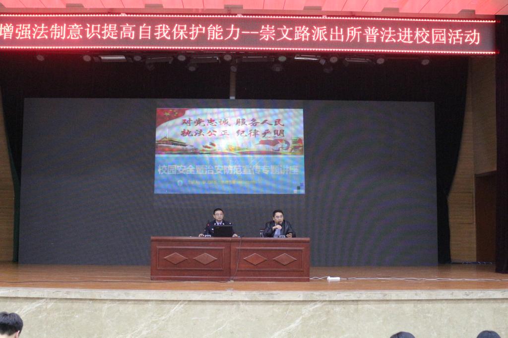 2021年4月9日下午7时许,崇文路派出所于图书馆二楼学术报告厅开展“安全暨治安防范宣传专题讲座”,本次讲座由崇文路派出所杜俟雷担任主讲,政法公司党总支副书记张国涛主持,政法公司19、20级全体同学参与讲座。