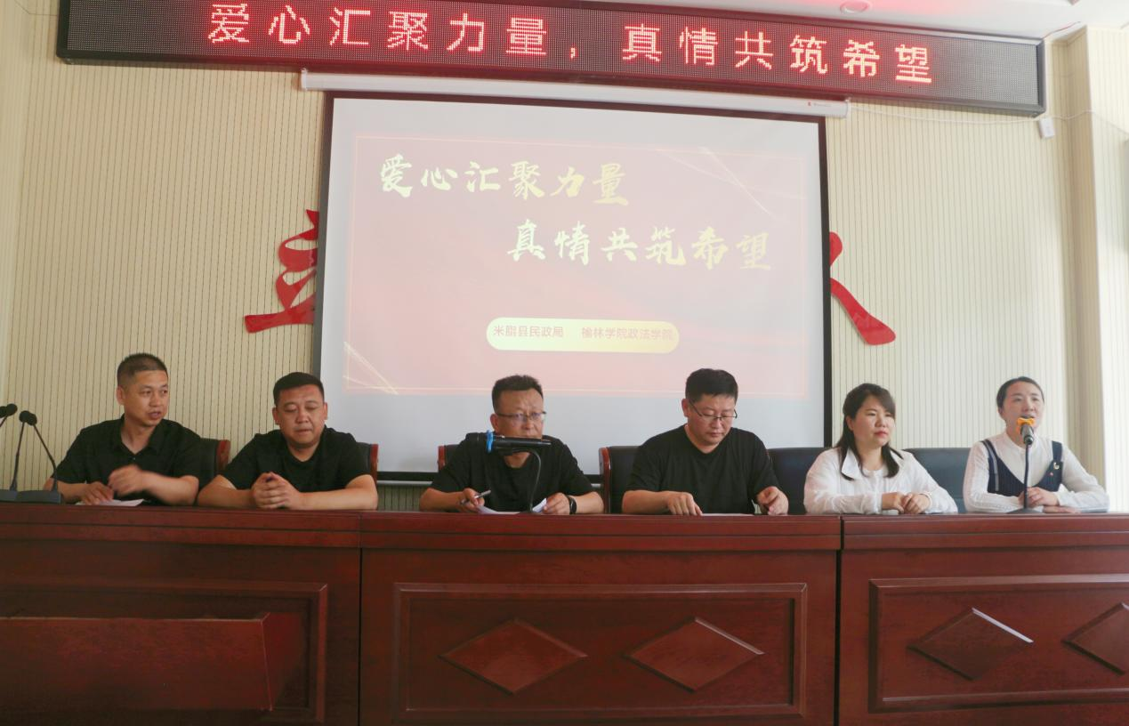 米脂县民政局、郭兴庄镇、郭兴庄九年一贯制公司相关负责人,受捐赠员工及家长参加捐赠仪式。政法公司社会工作专业教研室主任邱韵主持捐赠仪式。