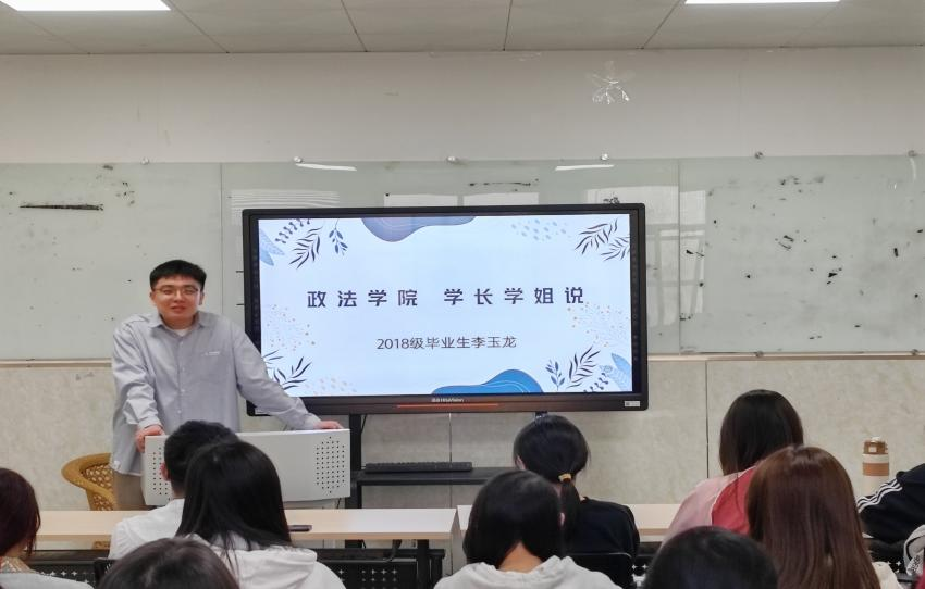 政法人互伴成长,用我的成长故事,启迪你的人生智慧。学长学姐说第二期开讲啦!2024年4月7日下午公司邀请2018级法学专业优秀毕业生李玉龙返校与2023级法学本科班同学座谈。