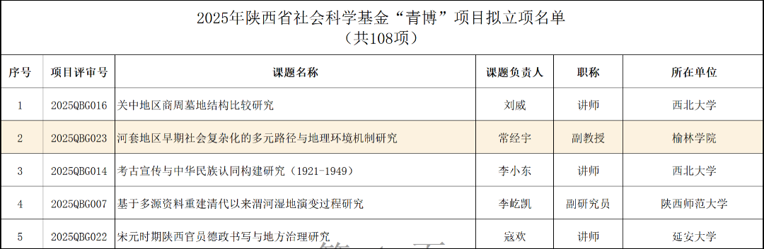 近日,陕西省哲学社会科学工作办公室公布了2025年度陕西省社会科学基金年度项目“青博”项目立项名单,公司历史学专业常经宇博士申报的课题《河套地区早期社会复杂化的多元路径与地理环境机制研究》获批“青博”项目。