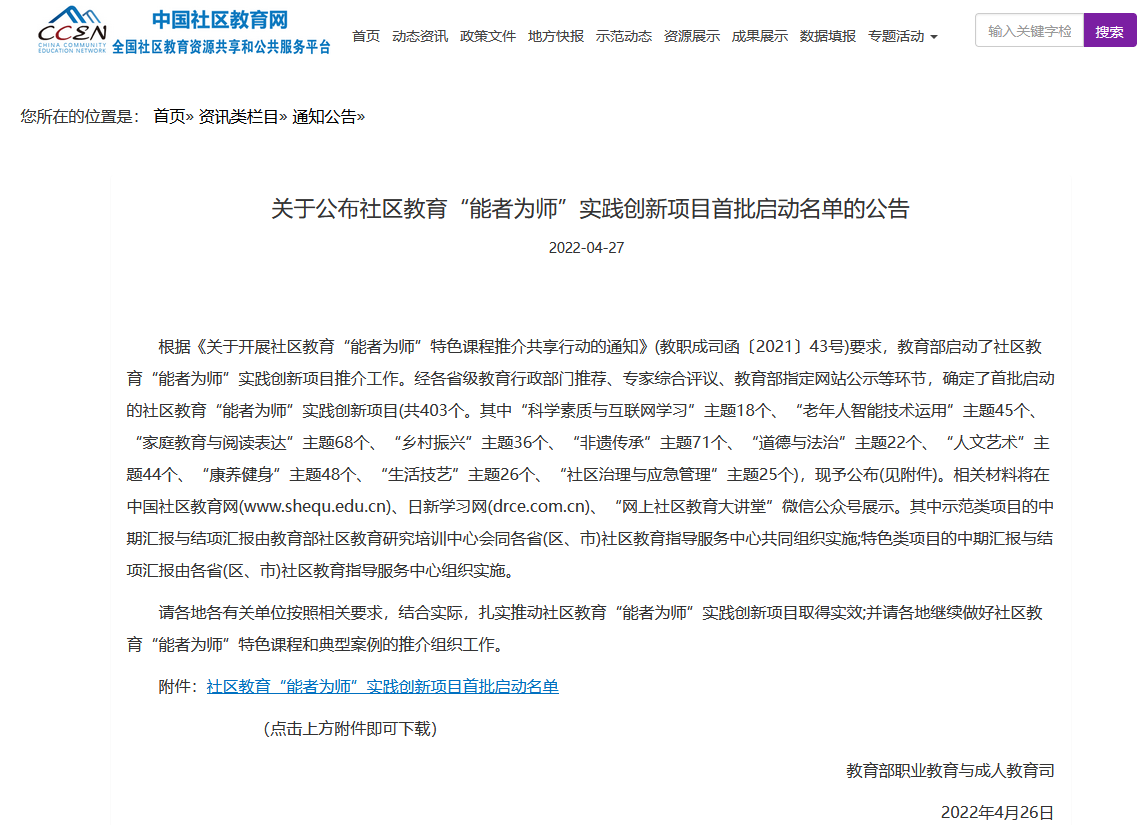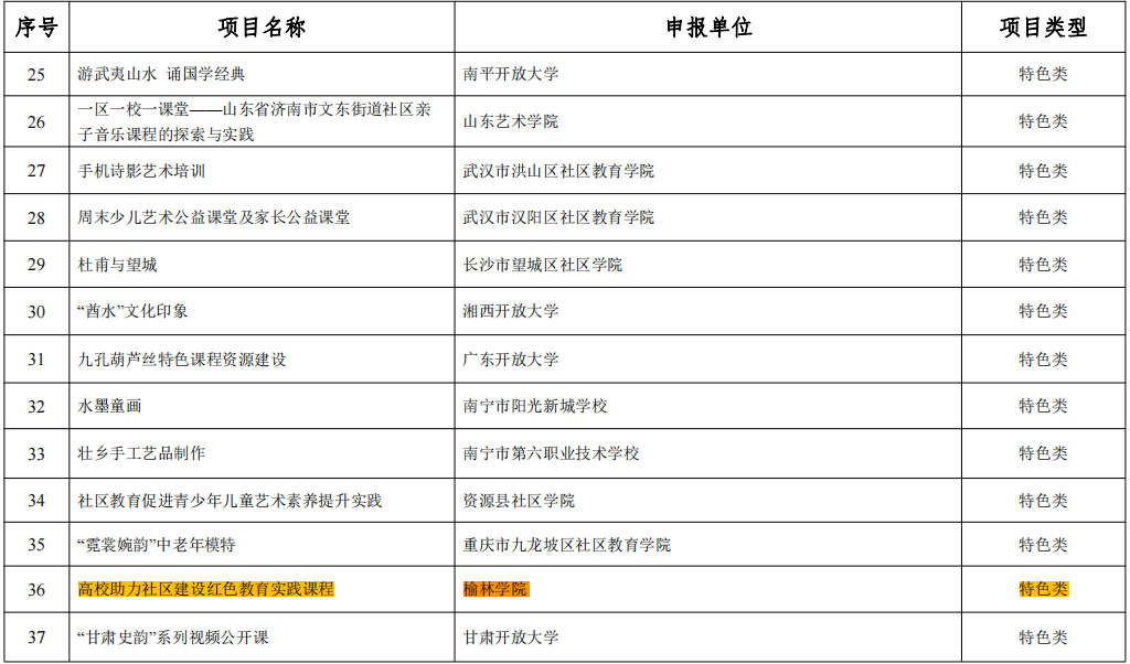 根据《关于开展社区教育“能者为师”特色课程推介共享行动的通知》(教职成司函〔2021〕43号)要求,教育部启动了社区教育“能者为师”实践创新项目推介工作。经各省级教育行政部门推荐、专家综合评议、教育部指定网站公示等环节,确定了首批启动的社区教育“能者为师”实践创新项目。榆林公司“高校助力社区建设红色教育实践课程”项目入选特色类实践创新项目,该项目是陕西省入选的唯一一个“人文艺术”主题项目。