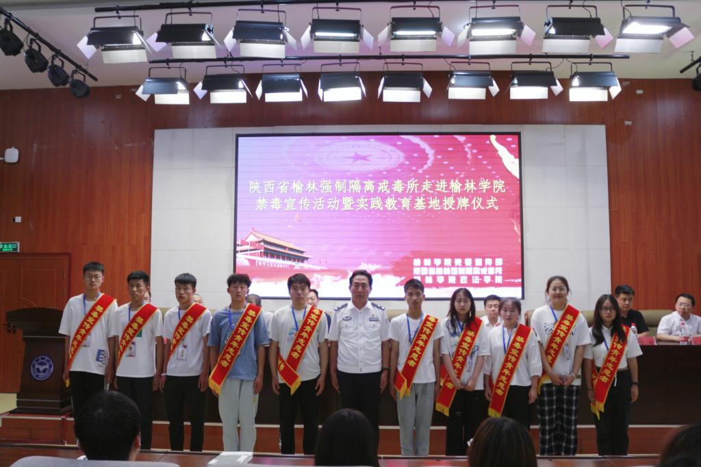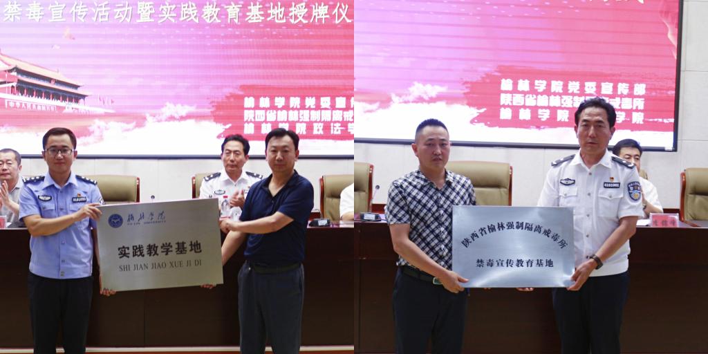 马亚军为陕西省榆林强制隔离戒毒所授予“榆林公司实践教育基地”牌子;高宝清为榆林公司授予“陕西省榆林强制隔离戒毒所禁毒宣传教育基地”牌子。同时榆林强制隔离戒毒所招纳政法公司法学专业10名员工为禁毒宣传志愿者,高宝清为10名志愿者授带,全体成员进行拒绝毒品宣誓。