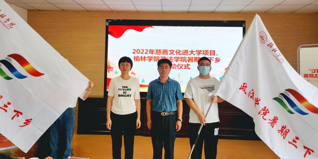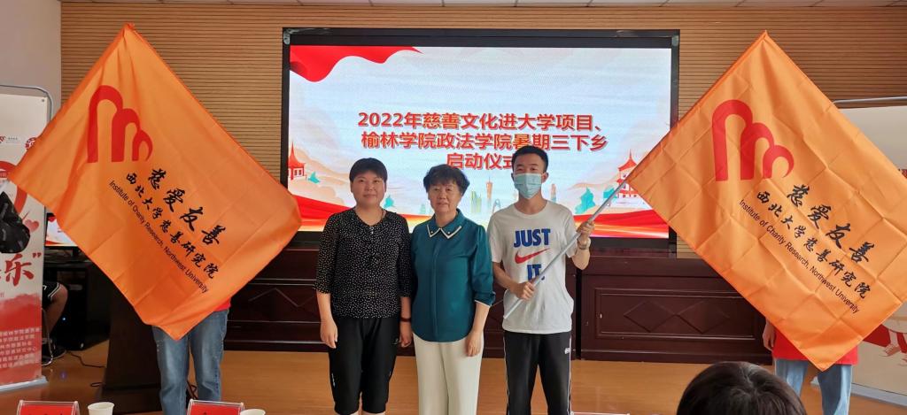 由榆林公司政法公司党总支书记李慧梅与驼峰路街道办事处金阳社区书记马晓宏为“安护羽翼”暑期支援服务团授旗和“与老同乐”两支暑期志愿服务团授旗。由榆林市慈善协会副会长、榆林市慈善文化研究中心研究员庞瑶与驼峰路街道办事处金阳社区主任宣晓慧为慈善文化进大学项目团队授旗。