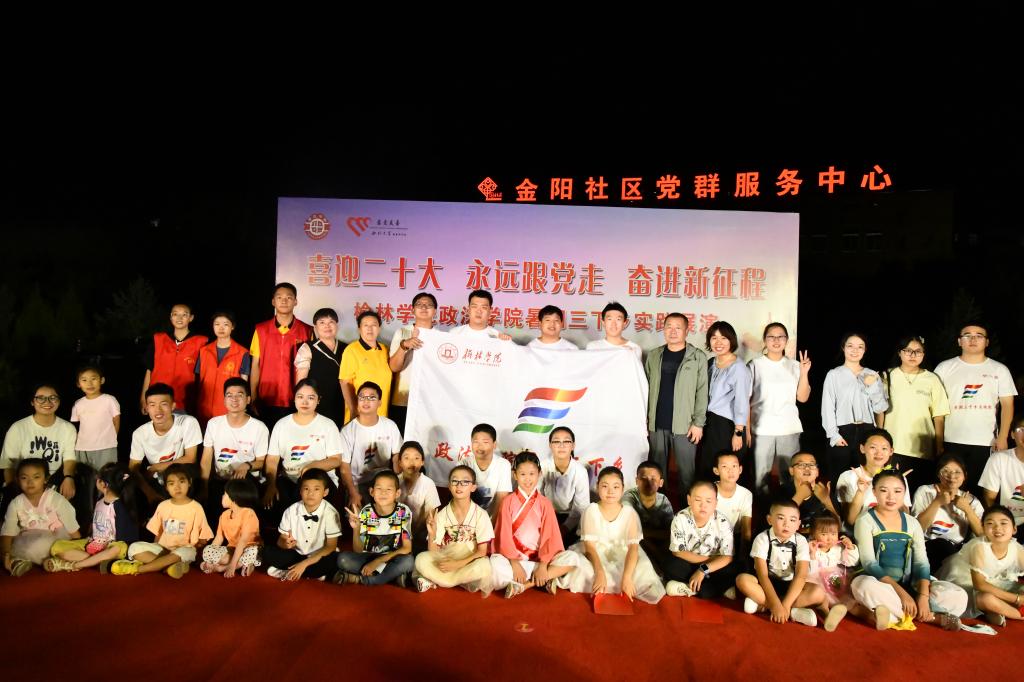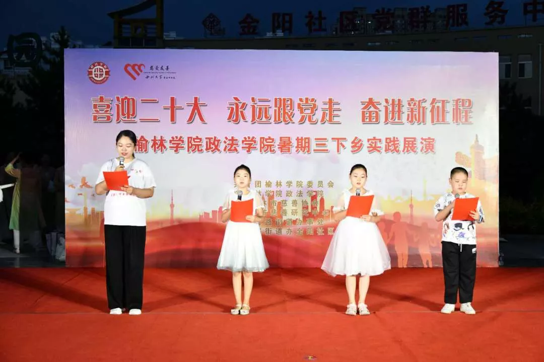 2022年7月30日19时30分,政法公司与驼峰路街道金阳社区联合于金阳社区北广场举办了“喜迎二十大,永远跟党走,奋进新征程”榆林公司政法公司暑期三下乡实践展演。参加本次晚会的领导有榆林公司政法公司经理白炜、驼峰路街道办事处金阳社区主任宣晓慧,榆林金秋春光队队长、禾苗课堂董事长贺莎莲,榆林公司政法公司团总支书记章赵晖。本次活动由王佳欣、刘梦璇、张皓伟、乔于涵主持。