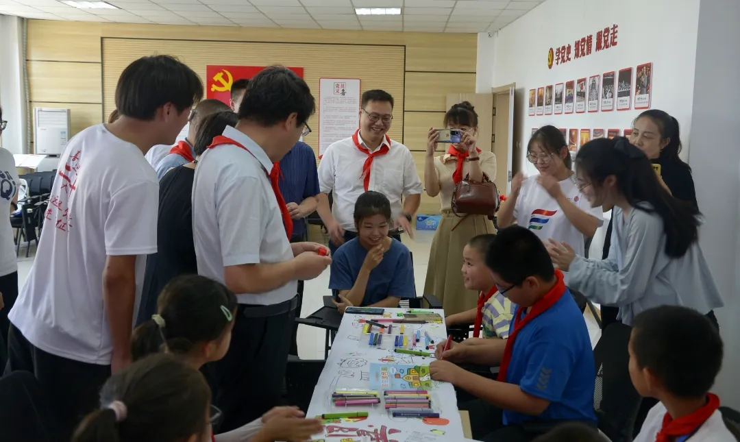 “安护羽翼”暑期服务队首先与小朋友们进行了暖场游戏,十五的月亮十六圆与手解千千结。在志愿者们的引导下,小朋友们非常活跃的进行了暖场游戏。现场气氛十分热烈。接下来张新柱书记、志愿者们与小朋友们共同在教室两侧两张5米画布上一起描绘了在暑期课程中印象最深刻的画面。小朋友们用手中的画笔在画卷上随意绘画着,共同描绘着与志愿者们在这些时日里的点点滴滴。随后,张新柱书记为小朋友带上了红领巾,并与小朋友们一起观看了回忆视频及志愿者对于小朋友的祝福。最后,由小朋友上台献唱《感恩的心》,表示了自己对于志愿者们的感谢。
