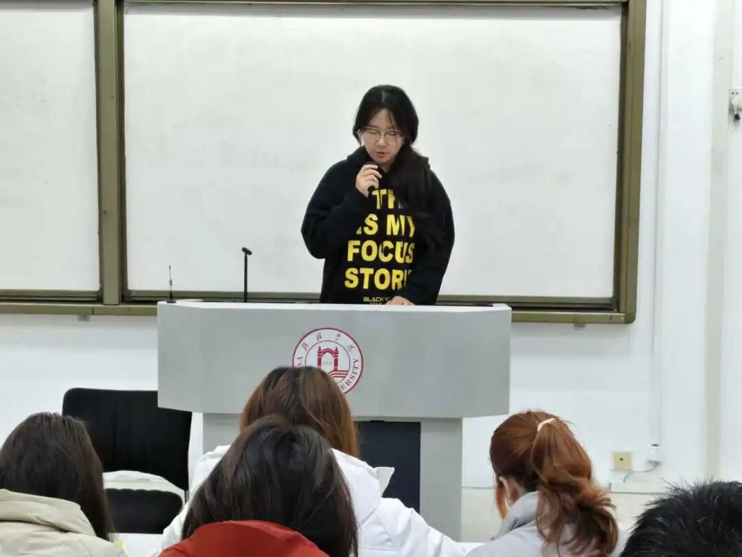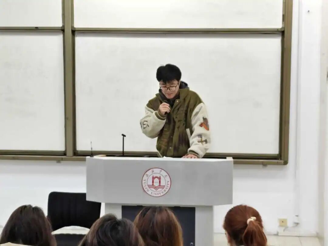其次,四名参与圣地行的员工代表分享了参与此次活动的感悟,向大家介绍了专业视角下延安精神的内涵以及如何践行延安精神,引发全场强烈共鸣。24级法学专业的张佩将延安时期"马锡五审判方式"的群众路线内核与当代法学专业素养培育相结合,谈到作为法学学子,要将延安精神中的求真务实、群众至上理念融入法律学习与实践。24级历史专业的梁旭超则带领大家重温杨家岭的窑洞里毛泽东同志撰写《实践论》《矛盾论》的岁月,并表示,新时代青年要从延安历史中读懂"坚定信念、艰苦奋斗"的真谛,将历史力量转化为追梦征程中的不竭动力。25级历史专业的马雯婕通过对比宝塔山作为精神地标承载的信仰力量、杨家岭作为决策核心彰显的责任担当,深入剖析延安精神的历史生成逻辑。25级社会工作专业的张郭权同学聚焦实践维度,他指出,延安时期"为人民服务"的根本宗旨与社会工作"助人自助"的专业理念高度契合,当年共产党人深入群众、解决民生难题的工作方法,为当代社会工作者提供了宝贵借鉴。