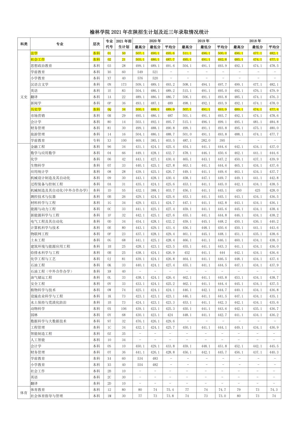 榆林公司 2021 年在陕招生计划及近三年录取情况统计
